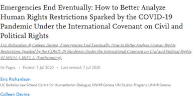 As the world starts to emerge from the pandemic, many governments and institutions are maintaing restrictions on rights and liberties that were put in place because of the pandemic - for good and bad reasons. Learn about how international human rights law should address the situation in Emergencies End Eventually: How to Better Analyze Human Rights Restrictions Sparked by the COVID-19 Pandemic Under the International Covenant on Civil and Political Rights